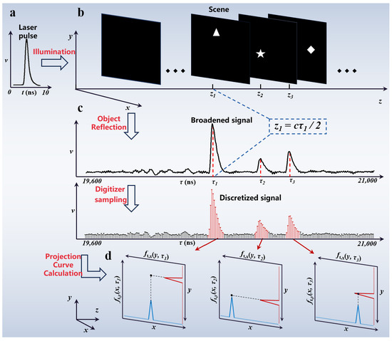 Overview of the detection and processing process; (a) time waveform of the system-emitted pulse laser; (b) drones distributed at different distances in the scene; (c) echo signal received by the detector, with discrete sampling of the signal. The distance information of the target can be calculated based on the time corresponding to the peak value, and the azimuth and pitch information of the target can be calculated based on the peak value; (d) projection curves of the target scene calculated using the intensity of the peak signal. The maximum point of the projection curve corresponds to the position of the target in the field of view.