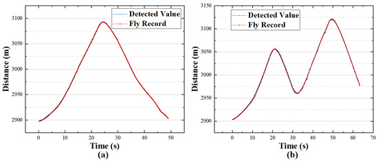 Distance detection results; (a,b) two flight trajectories, with the x-axis representing time and the y-axis representing distance. The blue dashed line represents the system’s measured distance values, while the red dashed line represents the recorded drone distances.