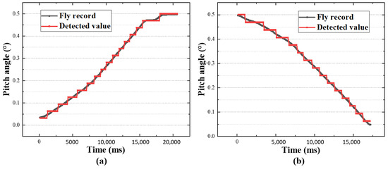 A comparison between the LiDAR system’s measured data and the actual drone data is shown in Figure 6. Figure 6a,b illustrate two flight trajectories, where the x-axis represents time, and the y-axis represents the drone’s pitch angle relative to the LiDAR system. The black dashed line represents the true pitch angle obtained based on the drone’s flight record, while the red dashed line represents the drone’s position measured with the LiDAR system.