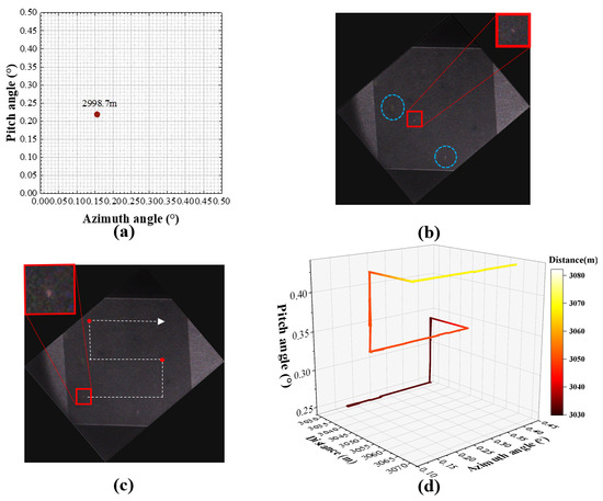 Figure 7a clearly shows the object’s position in the field of view, with an azimuth angle of approximately 0.16°, a pitch angle of about 0.22°, and a target distance of 2998.7 m. Figure 7b shows the image obtained with the CCD camera at the same moment, in which the bright spot within the red box represents the drone, whose position corresponded well with that in Figure 7a. Comparing Figure 7c with Figure 7d shows that the drone followed the path and that the LiDAR detected the drone’s trajectory consistent with that path.
