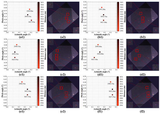 To assess the system’s capabilities in multi-target three-dimensional tracking, we conducted simultaneous tests with three drones in the same environment, as described in Section 3.3. The results obtained with the LiDAR system are illustrated in Figure 8. Figure 8a1 shows the three-dimensional information of the targets calculated with the LiDAR system using the echo signals. The x-axis represents the azimuth angle of the targets in the field of view, and the y-axis represents the pitch angle. The distances of the targets are marked on the graph as 2990.90 m, 3027.95 m, and 3050.35 m. The color bar, which transitions from red to black, corresponds to the distances from near to far. Figure 8b1 shows the image obtained with the CCD camera, with the red dots indicating lights emitted by the drones. Comparing Figure 8a1 with Figure 8b1 shows that the three target positions obtained using the LiDAR system corresponded one-to-one with the images obtained via the CCD camera. Figure 8a1–f1,a2–f2 sequentially present multiple detection frames during the tracking process with the LiDAR system. The three-dimensional information of the targets is provided in Figure 8a1–f1, while the images obtained with the CCD camera are presented in Figure 8a2–f2. In Figure 8a2–f2, yellow spots represent lights emitted from buildings behind the flying area. These lights are attributed to the relatively low altitude of the drones, which ranged from 30 to 80 m, and the nighttime testing conditions.