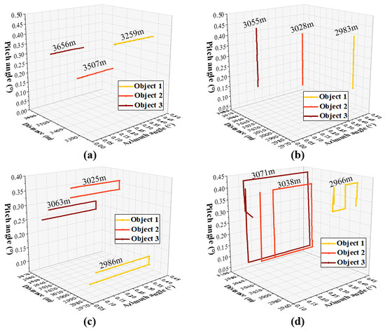 Figure 9a–d illustrate the three-dimensional motion trajectories of four groups of targets with different trajectories within the field of view, as detected by the LiDAR system. In these segments, multiple targets within the field of view are distributed at different distances. These targets primarily exhibit motion in the azimuth and elevation within their respective distance slices. The three axes represent the horizontal position, pitch position, and distance of the targets. The azimuth angle is used for horizontal position and pitch angle for the pitch position, with the distance measured in meters. The LiDAR system successfully captured the three-dimensional trajectories of the targets at different distances. The distances for each moving object are annotated in Figure 9. For example, object 1 was located at 3259 m, object 2 was located at 3507 m, and object 3 was located at 3656 m (Figure 9a).