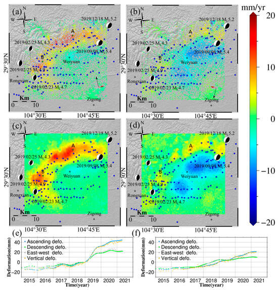 (a) Ascending LOS deformation velocity of the Weiyuan-Rongxian shale gas field over 2015–2021. (b) Descending LOS deformation velocity of the Weiyuan-Rongxian shale gas field over 2015–2021. (c) Vertical deformation velocity of the Weiyuan-Rongxian shale gas field over 2015–2021. (d) East-west LOS deformation velocity of the Weiyuan-Rongxian shale gas field over 2015–2021. (e) Deformation time series at point A. (f) Deformation time series at point B (blue dots in (a–d) represent the position of the shale gas production well platforms).