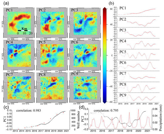 (a) The spatial distribution of 9 principal components. (b) Time series with 9 principal components. (c) Comparison between the time series of the first principal component and the cumulative number of shale gas production wells. (d) Comparison between time series of the second principal component and precipitation.