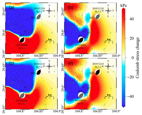 (a) Coulomb stress changes on the source mechanism plane 1 of the Weiyuan ML5.4 earthquake (strike = 25°, dip = 39°, rake = 70°), due to reservoir volume changes. (b) Coulomb stress changes on the source mechanism plane 2 of the Weiyuan ML5.4 earthquake (strike = 230°, dip = 52°, rake = 96°) due to reservoir volume changes. (c) Coulomb stress changes on the source mechanism plane 1 of the Zizhong ML5.2 earthquake (strike = 20°, dip = 41°, rake = 71°) due to reservoir volume changes. (d) Coulomb stress changes on the source mechanism plane 2 of the Zizhong ML5.2 earthquake (strike = 225°, dip = 52°, rake = 105°) due to reservoir volume changes. Green dots in the figure represent the position of the shale gas production well platforms, and black dots represent the position of the shale gas production well platforms.