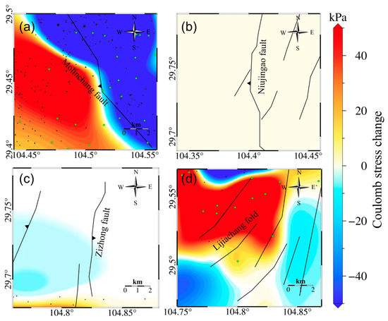 (a) Coulomb stress changes on the Molinchang fault (strike = 150°, dip = 40°, rake = 90°) due to reservoir volume changes. (b) Coulomb stress changes on the Niujingao fault (strike = 0°, dip = 30°, rake = 90°) due to reservoir volume changes. (c) Coulomb stress changes on the Zizhong fault (strike = 10°, dip = 20°, rake = 90°) due to reservoir volume changes. (d) Coulomb stress changes on the Lijiachang fold (strike angle = 45°, dip = 10°, rake = 90°) due to reservoir volume changes (green dots in the figure represent the position of the shale gas production well platforms, and black dots represent the position of the shale gas production well platforms).