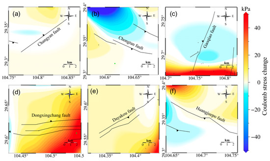 (a) Coulomb stress changes on the Changyan fault (strike = 230°, dip = 60°, rake = 90°) due to reservoir volume changes. (b) Coulomb stress changes on the Chongtan fault (strike = 110°, dip = 65°, rake = 90°) due to reservoir volume changes. (c) Coulomb stress changes on the Gaoqiao fault (strike = 190°, dip = 28°, rake = 72°) due to reservoir volume changes. (d) Coulomb stress changes on the Dongxingchang fault (strike = 90°, dip = 55°, rake = 90°) due to reservoir volume changes. (e) Coulomb stress changes on the Dayakou fault (strike = 25°, dip = 40°, rake = 90°) due to reservoir volume changes. (f) Coulomb stress changes on the Huangquepo fault (strike = 120°, dip = 30°, rake = 90°) due to reservoir volume changes (green dots in the figure represent the position of the shale gas production well platforms, and black dots represent the position of the shale gas production well platforms).