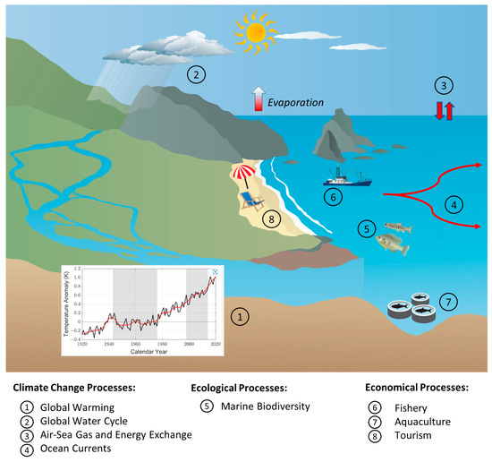 Sea Surface Temperature (SST) is a key essential climate variable (ECV) [1] as well as an essential ocean variable (EOC) [2] describing the temperature of the uppermost ocean layer. In the context of remote sensing, SST is mostly considered as the skin temperature of the ocean, which can be derived from thermal infrared radiation. Besides air temperature, SST is one of the main indicators of climate change [3]. It plays an important role in global lateral energy transport, radiative and turbulent air–sea energy exchange, absorption of anthropogenic greenhouse gases in the ocean, modification of the atmospheric boundary layer, and the global water cycle [4]. Furthermore, changes in SST affect marine ecosystems [5] and also have economic impacts, e.g., on the fishery [6] and aquaculture industries [7] and on tourism [8]. Therefore, they need to be monitored closely. Figure 1 provides an overview of global change processes, which can be derived from SST. After the Copernicus program of the European Union reported record-breaking marine heat-waves for summer 2023 [9], SST was in the headlines across all media. However, the years before this were already setting global temperature records again and again, which is reflected by the fact that the ten warmest years on record occurred after 2009 [10].