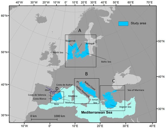 Overview of the study areas: North and Baltic Seas (A), Adriatic Sea (B), Aegean Sea (C), and Balearic Sea (D). The rectangles highlight the study areas, the light blue color highlights the extent of the Mediterranean Sea.