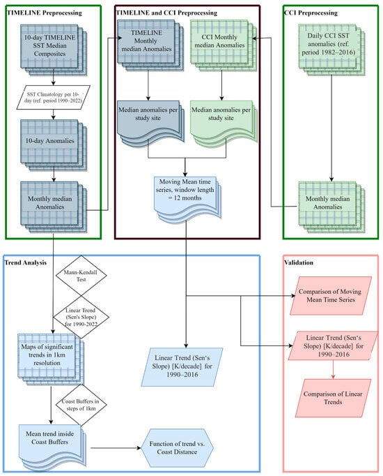 Flowchart illustrating the workflow of this study. The blue symbols are connected to TIMELINE SST, the green symbols are connected to CCI SST, light-blue symbols are connected to the trend analysis and the salmon-colored symbols are connected to the validation analysis.