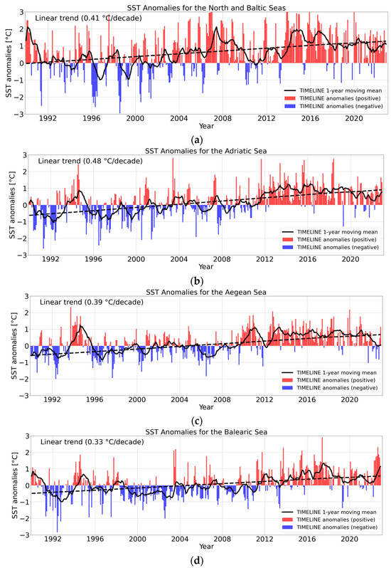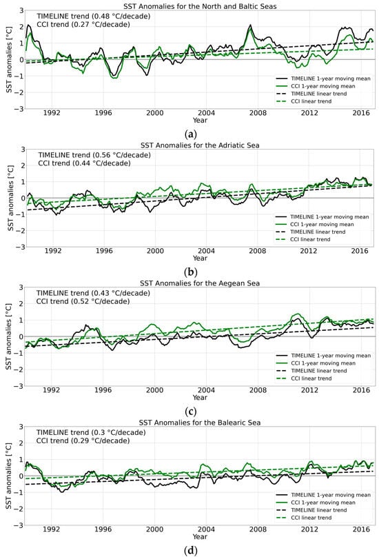 Figure 6 displays a comparison between the TIMELINE and the CCI time series, showing the moving average as well as the long-term trend for each study area for the period 1990–2016. Table 4 presents the result of the correlation between the monthly TIMELINE and CCI anomalies (coefficient R and the root mean square error (RMSE)) as well as the trend differences for the four study areas. It is apparent that the accordance between the TIMELINE and CCI anomalies in the Adriatic Sea, the Aegean Sea, and the Balearic Sea are quite similar with respect to R values, which are between 0.82 and 0.85, and RMSEs between 0.5 and 0.54 °C. Meanwhile, for the North and the Balearic Seas, the accordance is lower with an R value of 0.77 and an RMSE of 0.84 °C. For the Balearic Sea, the TIMELINE trend is similar to the CCI trend, while for the Adriatic and the Aegean Sea, the trend difference is in the order of 20% in relation to the trend. For the North and Baltic Seas, the TIMELINE trend is 75% higher than the CCI trend. Figure 6 reveals that the TIMELINE and CCI moving averages show similar patterns for large parts of the time series for all study areas. Higher differences are visible during the period from 1994 to 1995, where the TIMELINE anomalies are considerably higher than the CCI anomalies in the Mediterranean study areas. Possible causes for that will be discussed in Section 5. Furthermore, there is a positive offset of the CCI towards the TIMELINE moving average for large parts of the time series in all study areas. This offset can be explained by the different reference periods: While the CCI anomalies are based on the period 1982–2016, the TIMELINE anomalies are based on the period 1990–2022. However, because of the higher trends in the TIMELINE anomalies, this offset decreases towards the end of the time series.