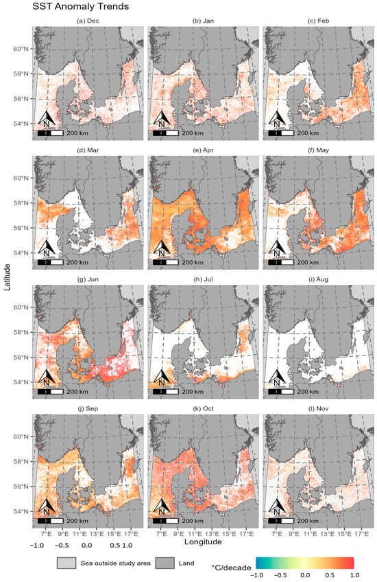 Spatial distribution of SST trends for each month in the North and Baltic Seas.