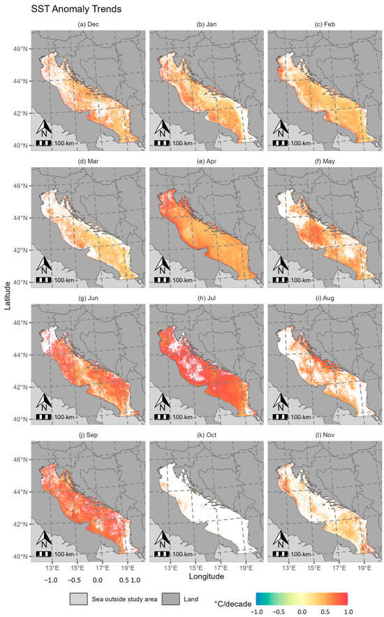 For the Adriatic Sea (Figure 8), trends are highest in June, July, and September, exceeding 0.5 °C/decade almost through the whole study area. Especially high trends can be seen along the Italian coast (up to 1 °C/decade) around the Gargano Peninsula and the Gulf of Venice. In the summer months, high trends can also be observed on the Balkan coast.
