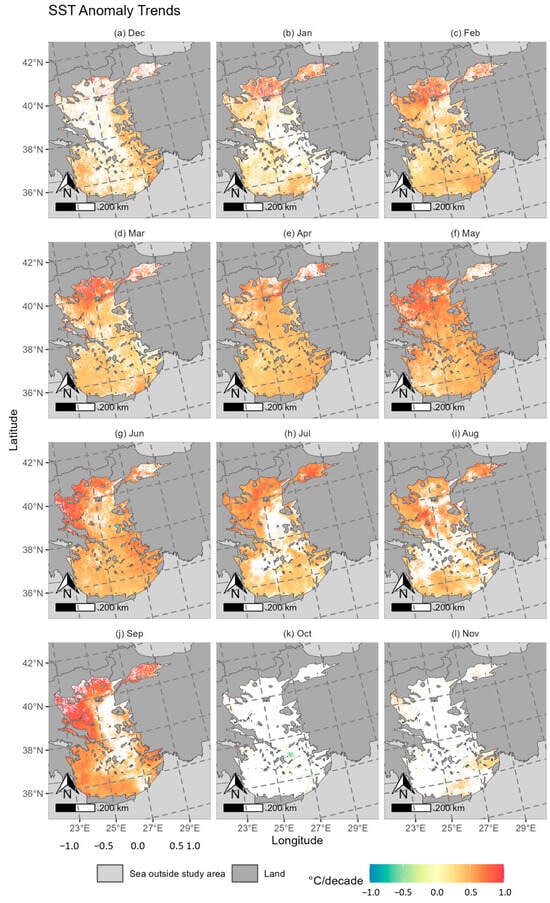 For the Aegean Sea (Figure 9), high positive trends (>0.5 °C/decade) are visible in the northern part (Thracian Sea and Thermaic Gulf) almost throughout the whole year, with the exception of the period from October to December. The trend is highest in September (up to 1 °C/year). In August, a hotspot with very high trends can be observed north of the island Skyros. The highest trends in the Sea of Marmara can be observed in the summer months from June to September.
