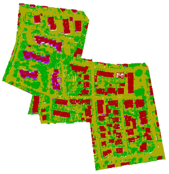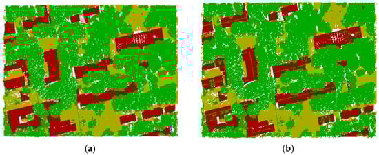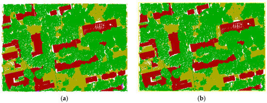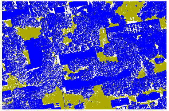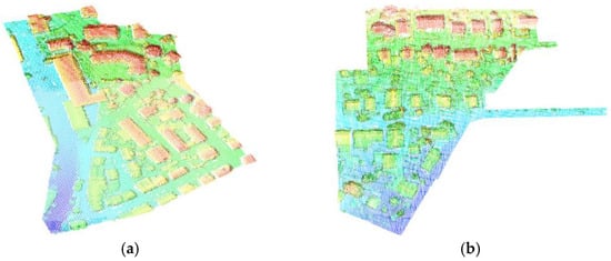 To evaluate the performance of our proposed method, we conducted experiments on two datasets: the Urban-LiDAR dataset (https://www.lidar360.com/ accessed on 2 May 2022) and the Vaihingen dataset (http://www2.isprs.org/ accessed on 7 April 2022). The Urban-LiDAR dataset consists of a total of 719,823 points. The dataset includes various types of objects, including buildings, trees, and ground points, as shown in Figure 11. The terrain in this area has undergone significant changes, with dense vegetation and high buildings.