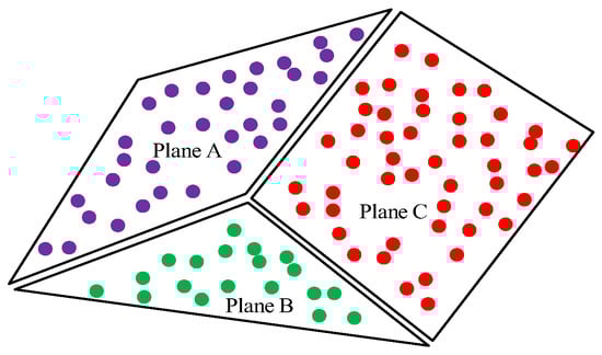 After identifying non-ground points in the point cloud, we use the region growing algorithm to obtain the coarse extraction of the building point cloud from non-ground points. The algorithm selects the point with the minimum curvature as the initial seed point. Given a neighboring point A of a seed point B, if the angle between the normal vector of A and that of is less than a given threshold (Equation (4)) and the curvature value of is less than a given threshold value (Equation (5)), point A is considered a new seed point. The region continues to grow until all points are processed (Figure 4) [19].