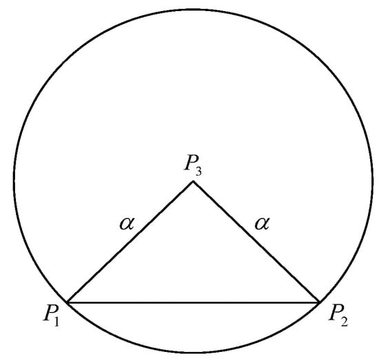 - All possible pairs of projected points are processed in the same way. For any pair of points and from projected point cloud on the XOY plane of point cloud S, the center point of the circle whose distance from is calculated and is equal to based on the distance intersection method (Figure 7) [21]:where