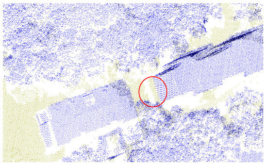 Subsequently, the building point cloud is upgraded by merging with the façade point cloud near the ground, which is obtained by conducting mask extraction on the original points instead of non-ground points and setting appropriate values for the Z-axis to adjust the height to a certain distance from the ground (Figure 9). Given that the façade point cloud may overlap with the existing building point cloud, the duplicate points are removed from the merged building point cloud. Finally, we use the radius filtering algorithm to remove the discrete noise points within the building point cloud.
