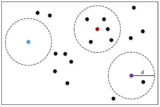 The main idea of the radius filtering algorithm is to assume that each point in the original points contains at least a certain number of neighboring points within a specified radius neighborhood [23]. When this assumption is satisfied, the point is considered a valid point and retained. On the contrary, if the conditions are not met, it will be identified as a noise point and removed. As an example, Figure 10 specifies a radius of d. If at least one adjacent point is specified within this radius, only the blue points in the figure will be removed from the point cloud. If at least two adjacent points are specified within the radius, both the purple and black points will be removed.
