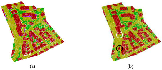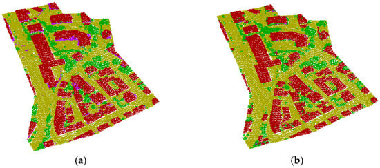 Urban-LiDAR’s extraction results: ground points are in dark yellow; tree points are in green; the facades are in purple; the roofs are in red. (a) Ground truth; (b) the extraction results using the proposed method.