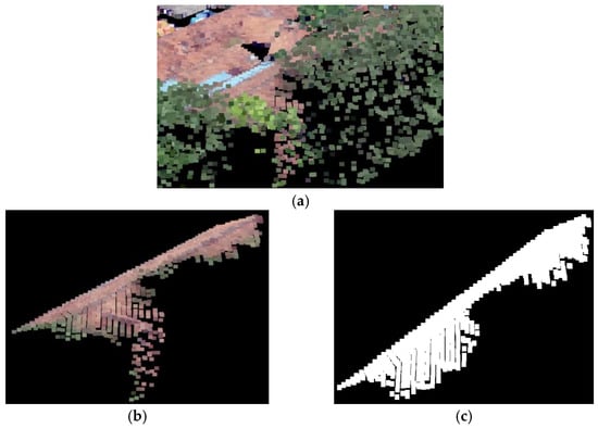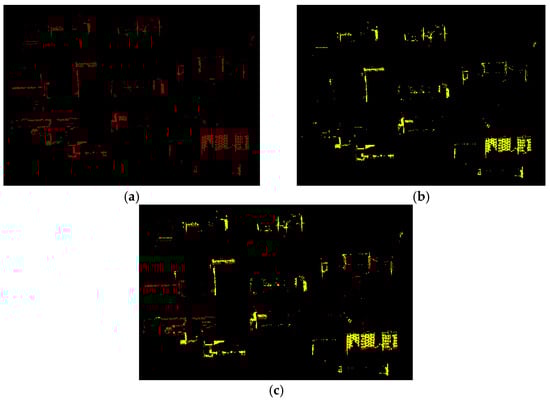 (a) Facade points within mask polygons in the original points; (b) the facade points within mask polygons in the non-ground points; (c) the overlay of (a,b).
