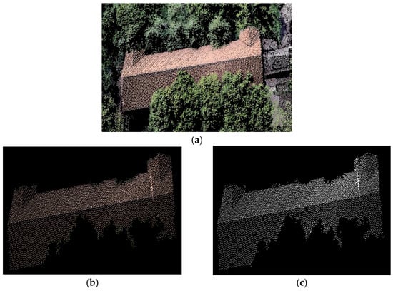 In addition, we evaluated the effectiveness of building point extraction in two different scenes from the Urban-LiDAR dataset: a complex scene and a low-density scene. Figure 18c displayed the extracted building point cloud using the proposed method in the complex scene, and the precision, recall, and F1 score of the roof were 98.82%, 98.38%, and 98.60%, respectively. It demonstrated that the proposed method could extract building points accurately in the complex scene. Figure 19c shows the extraction results using the proposed method in the scene with low point density. The recall of the roof was only 92.02%, but the precision was 99.41%, and the F1 score was 95.57%. It could be seen that there were relatively dense points with significant fluctuations at the edges of the original points, and even if we used the region growing algorithm to process it, points at that location could still be lost.