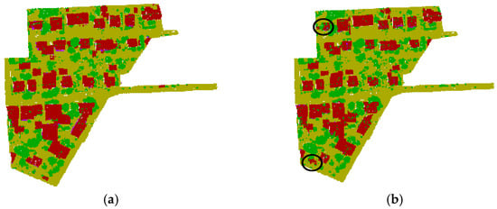 Although the proposed method achieved high accuracy in extracting the Vaihi-1 point cloud and the Vaihi-2 point cloud, there were still some shortcomings. Due to the limitations of the CSF algorithm, it may have difficulty extracting certain roof points close to the ground, such as those points shown in the white circle in Figure 20b. In addition, it was difficult to extract building points solely based on geometric information for some roofs with significant undulations, as shown in the black circle of building points in Figure 20b and Figure 21b.