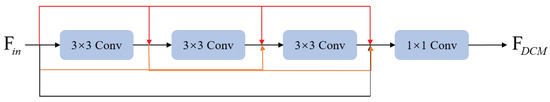 Due to the fact that traditional convolutional neural networks can capture the features of similar objects in different local regions using stacked convolutional layers to extract hierarchical features, we use a dense connected network [44] to extract local features, as shown in Figure 2. According to Figure 2, the output of the DCM module can be obtained as follows: