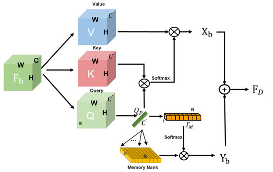 Given the current band of the image, its adjacent bands are , where H and W are the height and width of the HSI, and represents the neighboring band span of the current band. In the first stage of our network, each band is passed through a DCM in the feature space to obtain a feature map . To model the non-local spectral correlation of the HSI, we designed a cross-band non-local spectral memory-augmented attention network (MAN), as shown in Figure 3.