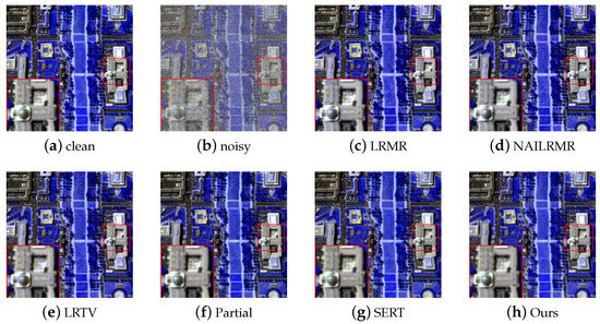 Figure 6a is a pseudocolor image from the original HSI Pavia University dataset affected by noise interference, and Figure 6b–g are the denoised results of algorithms LRMR, NAILRMR, LRTV, Partial DNet, SERT, and the proposed algorithm, respectively. According to the previous literature [34], the Pavia University dataset is weakly affected by noise interference. Therefore, the results of traditional denoising algorithms LRMR, NAILRMR, and LRTV are similar to those of deep learning-based denoising methods Partial-DNet and SERT on the Pavia University dataset. After zooming in on all the denoising results, it can be found that our proposed algorithm maintained better and clearer texture details, and some oversmoothing phenomena occurred using the Partial-DNet and SERT methods.