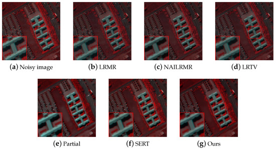 Pseudocolor results (red: band 77, green: band 2, and blue: band 1) of Case 2 on the Pavia Unversity dataset. (a) Noisy image. (b) LRMR. (c) NAILRMR. (d) LRTV. (e) Partial-DNet. (f) SERT. (g) Ours.