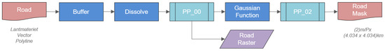 Road networks are also commonly available from national traffic authorities and are often made available as center-line data with attributes such as width, speed limit, and access. In Sweden, Lantmäteriet and Trafikverket provide road data as road center lines in the form of LineStrings or MultiLineString vector data. The vector data consist of twenty road classes, such as tunnels, thoroughfares, public roads, roads under construction, and a range of road widths for each line. We simplify the roads into four common classes with the same width and assign fixed road widths to their respective classes. The center-line data are then post-processed to form landscape masks for the Unreal Engine. First, we offset each road center line by a fixed distance to create a polygon around each line by performing a spatial buffer across all center-line polylines per road class. Then, we dissolve the resulting polygon buffer to form the road boundary regions. If there are disjointed road networks, we create multiple dissolved regions, but in most cases, a single closed region is created to form the road boundary region. We then rasterize (PP 00), tile (PP 01), and rename (PP 02) the road tiles, as shown in Figure 4.