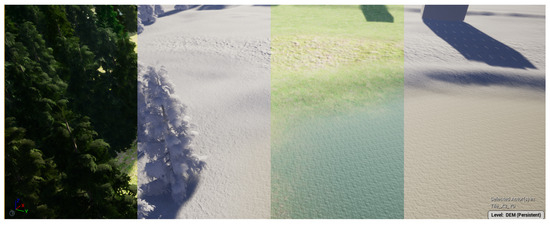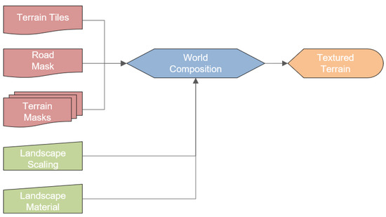 Digital terrain models (DTMs) are commonly available from most national mapping agencies. A DTM is often made available as tiled raster images, where each pixel is assigned a value representing the height of the ground at that position. In Sweden, Lantmäteriet provides a DTM at a two-meter-per-pixel resolution of 6.25 square kilometer tiles. To ensure the workflow is procedural, we introduce a post-processing step that re-samples the incoming DTM raster to a pre-determined cell spacing. The DTM is then combined into a single raster mosaic and further re-tiled into specific dimensions to ensure the maximum area while minimizing the number of tiles within the Unreal Engine (https://docs.unrealengine.com/5.0/en-US/landscape-technical-guide-in-unreal-engine/ accessed on 3 May 2023). The final step in creating the terrain tiles is to ensure the tiles are systematically named for Unreal Engine to identify the tiling layout. Once the terrain tiles are generated, they can be imported into the Unreal Engine using the World Composition feature. Figure 3 shows a flowchart of the different steps used to generate the terrain masks.