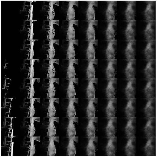 To visualize volumetric data available throughout a 3D space, such as air pollution or noise levels, we again employed the strategy of encoding the data into textures (data textures) (see Figure 9) that can be used for real-time visualization in Unreal Engine. These textures are then used to, e.g., create dynamic cut-planes using materials coded in Unreal Engine to look up the data dynamically based on the current 3D position on the surface. As these textures fold 3D data into a 2D texture, particular care must be taken to interpolate data along the z-axis (up/down in Unreal Engine). Data from the same x–y-coordinate is sampled from two places in the data texture, corresponding to the two closest z-coordinates in the data. Then, these data are interpolated to reflect the exact z-coordinate that should be sampled. The same data textures are also used as the basis for particle visualizations using the Niagara particle system in Unreal Engine, changing color, size, lifetime, etc., of particles depending on the data corresponding to the particle’s position in three dimensions.