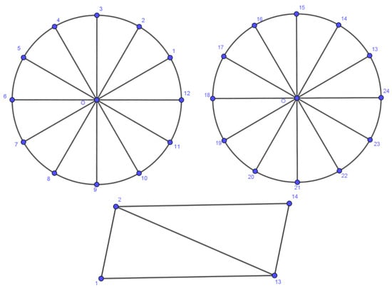 Once the vertices have been generated, the next step of the process is to create the required triangles to connect them. Considering Figure 10, we generate a cylinder cap for the parsed point by connecting every three vertices counterclockwise. This process is repeated for all the parsed points of a single streamline. For the mesh to look streamlined, we must connect the generated vertices belonging to different points. Figure 11 displays the generated vertices for the first and second points of a streamline, respectively. Then, to create a cylinder-like mesh between the two streamline caps, we generate a parallelogram for vertices 1, 2, 13, and 14 (displayed in the lower image section on Figure 11.