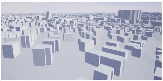 The building meshes are generated using two datasets provided by Lantmäteriet, the building footprints, and a LiDAR point cloud using the Builder platform [54]. First, we determine the mean height of the buildings by averaging the values of points in the z dimension above a building’s footprint. An LoD1 building mesh is generated by extruding the building footprints to their respective heights. The buildings are then repositioned in the z dimension to meet the terrain and generate the building mesh. The building mesh is translated to be compatible with the modified coordinate system within the Unreal Engine to align with the rest of the generated data. This mesh is then imported into the Unreal Engine, as shown in Figure 6.
