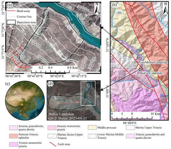 - Ouyang, C.J.; An, H.C.; Zhou, S.; Wang, Z.W.; Su, P.C.; Wang, D.P.; Cheng, D.X.; She, J.X. Insights from the failure and dynamic characteristics of two sequential landslides at Baige village along the Jinsha River, China. Landslides 2019, 16, 1397–1414. [Google Scholar] [CrossRef]