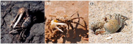 The researched species: (a) red-clawed fiddler crab (Uca arcuata), (b) milky fiddler crab (Uca lactea), and (c) ghost crab (Ocypode stimpsoni).