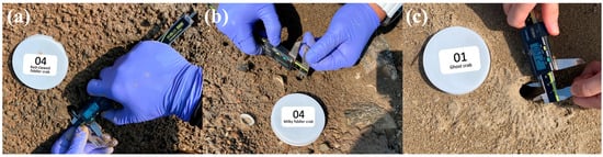 To correlate the in situ data with remote imagery, numbered markers were placed at each measured burrow to serve as reference points within the orthoimages (Figure 3). The drone flight for image acquisition was scheduled immediately after field measurements to capture the burrow openings in conditions that closely resembled those observed during the field survey. This methodology was designed to capture the dynamic nature of the tidal flats and the organisms within. By closely synchronizing the in situ measurements with the drone imaging, we ensured a high degree of accuracy in representing the burrow openings, taking into account the biological activity of the macroinvertebrates that could influence the structural integrity and appearance of their burrows.