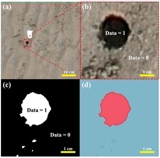 The process of extracting and measuring burrow openings was meticulously conducted using annotated orthoimages. Individual bounding boxes, corresponding to the burrow locations identified within the images, were extracted (Figure 5a,b). In these images, the burrow openings are distinguishable by their low reflectance, appearing darker compared to the brighter, higher reflectance of the surrounding sediment (Figure 5b). This difference in reflectance, quantified by digital number (DN) values, facilitated the feature differentiation within the imagery.