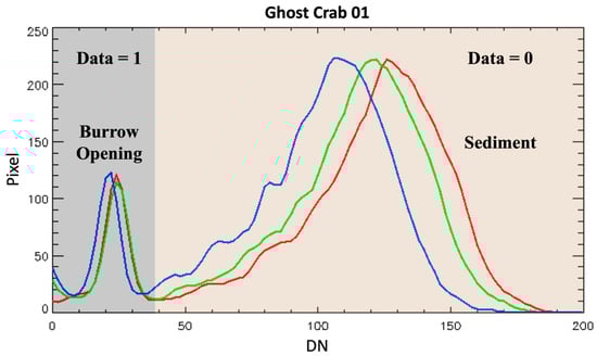 The segmented images, aligning with the in situ measurement labels, were further processed to isolate the burrow openings, resulting in the binary images illustrated (Figure 5c). RGB-DN histograms (Figure 6) played a pivotal role in this process, enabling the distinction between the dark burrow openings and the brighter sedimentary background. This distinction was evident through two significant peaks in the histogram, corresponding to the contrast in reflectance. The histogram analysis involved identifying the lowest DN value of the first peak as the baseline and extracting a threshold at the 98th percentile of the normal distribution from this baseline. This threshold value was used to discern burrow openings from the sedimentary background, with pixels below this threshold selected for detailed analysis.