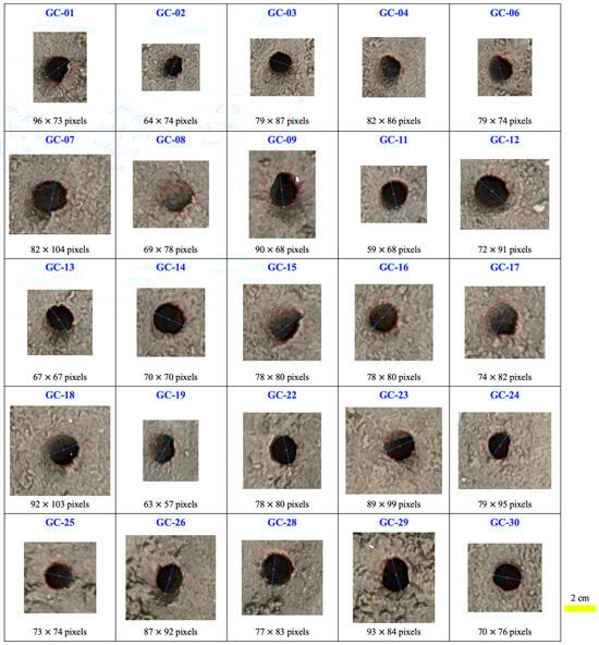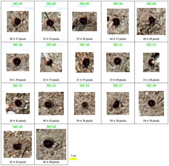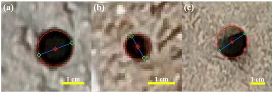 To accurately delineate the actual boundary of each burrow opening, circles were constructed so that their circumferences precisely passed through the terminal points of the diameter. These circles, outlined with solid red lines, effectively encapsulate the true extent of the burrow openings. The graphical depictions of these measurements, incorporating the annotated points and circles, were then saved in the PNG format for archival and further analysis.