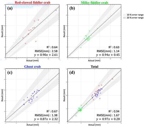 The relationship and RMSE between the actual measurement and the results. (a) Red-clawed fiddler crab, (b) milky fiddler crab, (c) ghost crab, and (d) total of the three species. Red, green, and blue represent the red-clawed fiddler, milky fiddler, and ghost crab, respectively. The grey areas indicate regions with an error range. The black dotted lines indicate the linear regression between the actual measurement and the results.