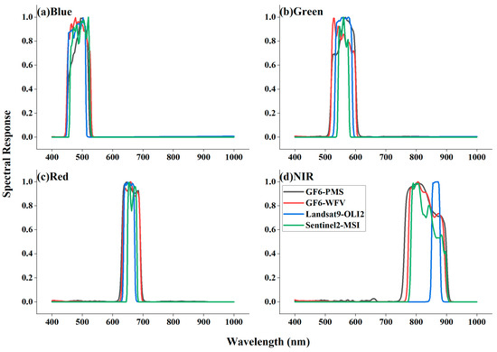 Spectral response functions of Landsat9-OLI2, Sentinel2-MSI, GF6-PMS, and GF6-WFV.