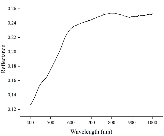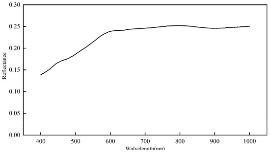 The Dunhuang calibration site was selected for radiometric cross-calibration, using Landsat9 and Sentinel2 as reference sensors for the GF6-PMS and WFV sensors. Factors affecting the accuracy of radiometric cross-calibration include differences in sensor performance and the impact of observation time on land and atmospheric parameters. Therefore, when selecting images, it is essential to minimize the observation time difference between different sensors. To ensure the accuracy of radiometric cross-calibration, it is preferable that images taken on the same day are selected, and the atmospheric clarity of the calibration site at the time of the overpass should also be considered. After screening, it was determined that all four sensors passed over the Dunhuang calibration site on the same day, on 15 February 2022, under good atmospheric conditions. In addition to acquiring images from different sensors, radiometric cross-calibration also requires atmospheric parameters and land reflectance data, with atmospheric parameters derived from MODIS’ s 550 nm aerosol optical depth (AOD) and sand reflectance at the Dunhuang calibration site. The observation parameters of the four sensors on 15 February 2022 are shown in Table 1, and the measured sand reflectance is shown in Figure 3.