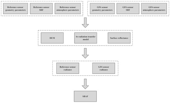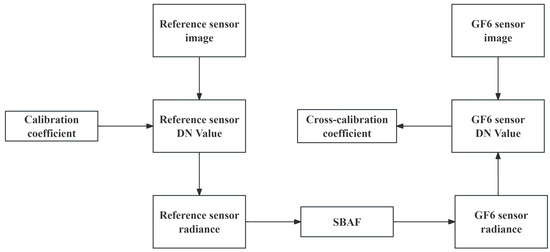 Radiometric cross-calibration, as a more efficient calibration method when compared with site calibration, allows for the monitoring of the radiative performance and calibration of sensors using historical data. Compared with traditional site radiometric calibration processes, radiometric cross-calibration is relatively straightforward but requires consideration of various factors that affect calibration accuracy, such as the observational geometry of different sensors, atmospheric conditions, and SRF. For the radiometric cross-calibration study of the GF6-PMS and WFV sensors, this study implemented a cross-radiometric calibration method based on the Spectral Band Adjustment Factor (SBAF), with the specific process illustrated in Figure 4.