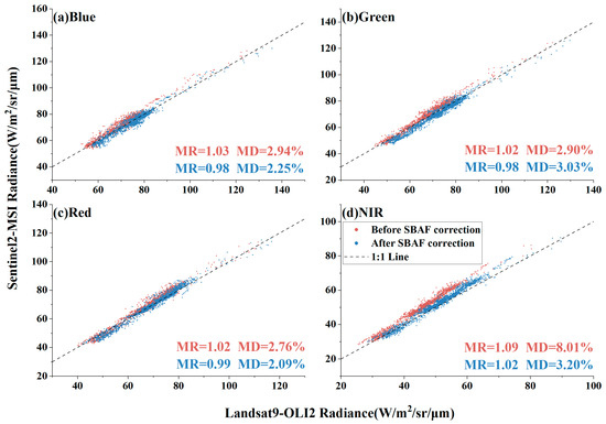 Excluding the green band, it is evident from Figure 6 that the MD between the reference sensors shows a significant reduction after SBAF correction, particularly in the NIR band, where the MD decreased from 8.01 to 3.20%. In the post-SBAF correction, the radiance ratios of the four bands are closer to a 1:1 line, with an average MD across bands of only 2.64%. This indicates that SBAF effectively minimizes radiance discrepancies arising from differences in observation geometry and SRF, thereby enhancing the precision of radiometric cross-calibration.