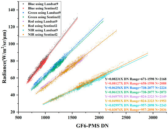 Linear fitting results of radiometric cross-calibration for GF6-PMS.