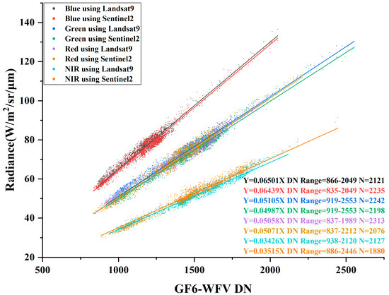 Linear fitting results of radiometric cross-calibration for GF6-WFV.