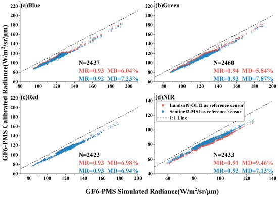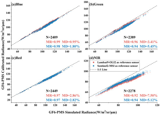 Evaluation and validation of radiance results for GF6-PMS simulated using Sentinel2-MSI versus calculated using radiometric cross-calibration coefficients (MD and MR are the mean relative difference and mean ratio, respectively).